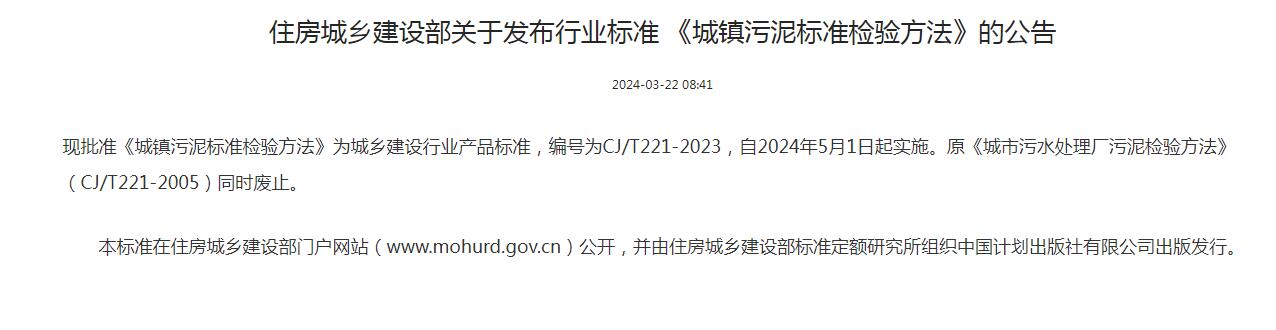 住房城乡建设部关于发布行业标准 《城镇污泥标准检验方法》的公告