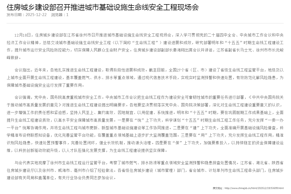 住房城乡建设部召开推进城市基础设施生命线安全工程现场会