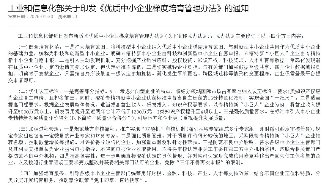 工业和信息化部关于印发《优质中小企业梯度培育管理办法》的通知