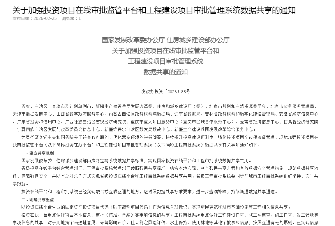 关于加强投资项目在线审批监管平台和工程建设项目审批管理系统数据共享的通知
