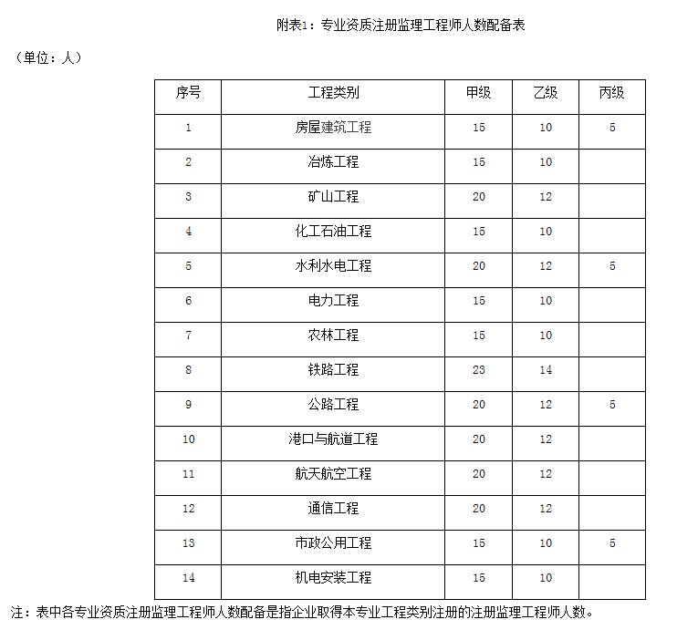 (3)相应专业的注册监理工程师不少于《专业资质注册监理工程师人数配备表》(附表1)中要求配备的人数。