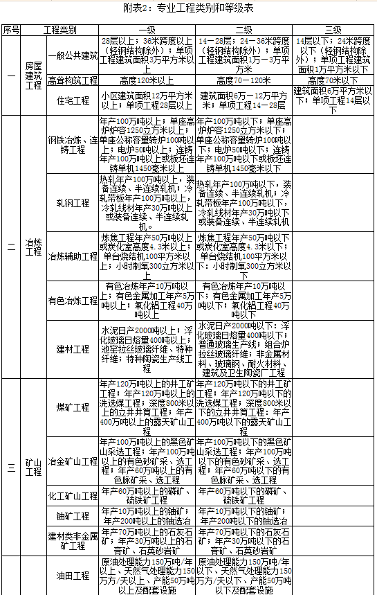 2.专业工程类别和等级表