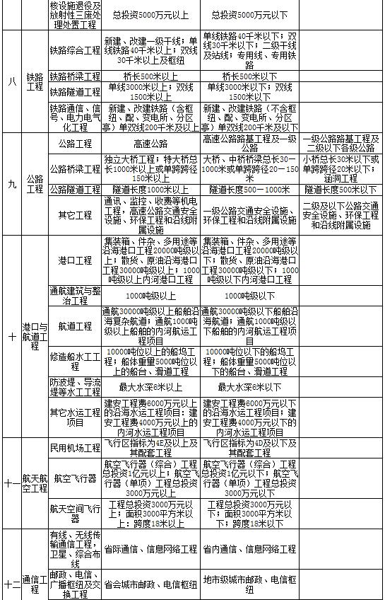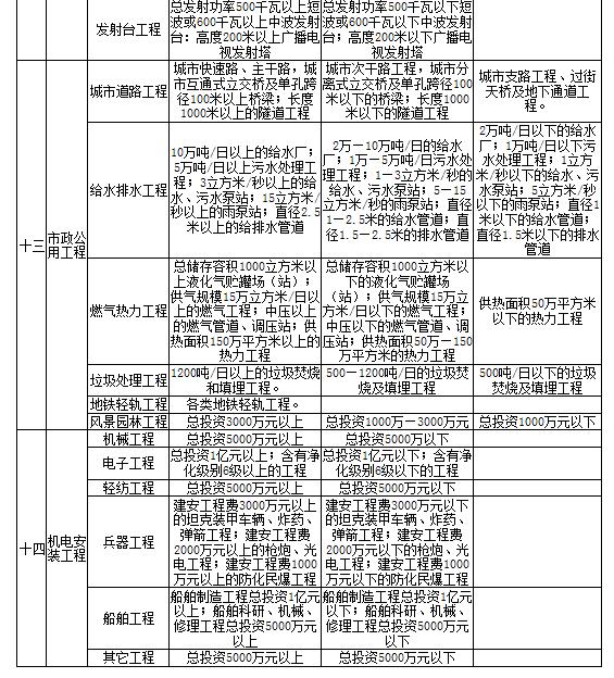 2、未列入本表中的其他专业工程,由国务院有关部门按照有关规定在相应的工程类别中划分等级。