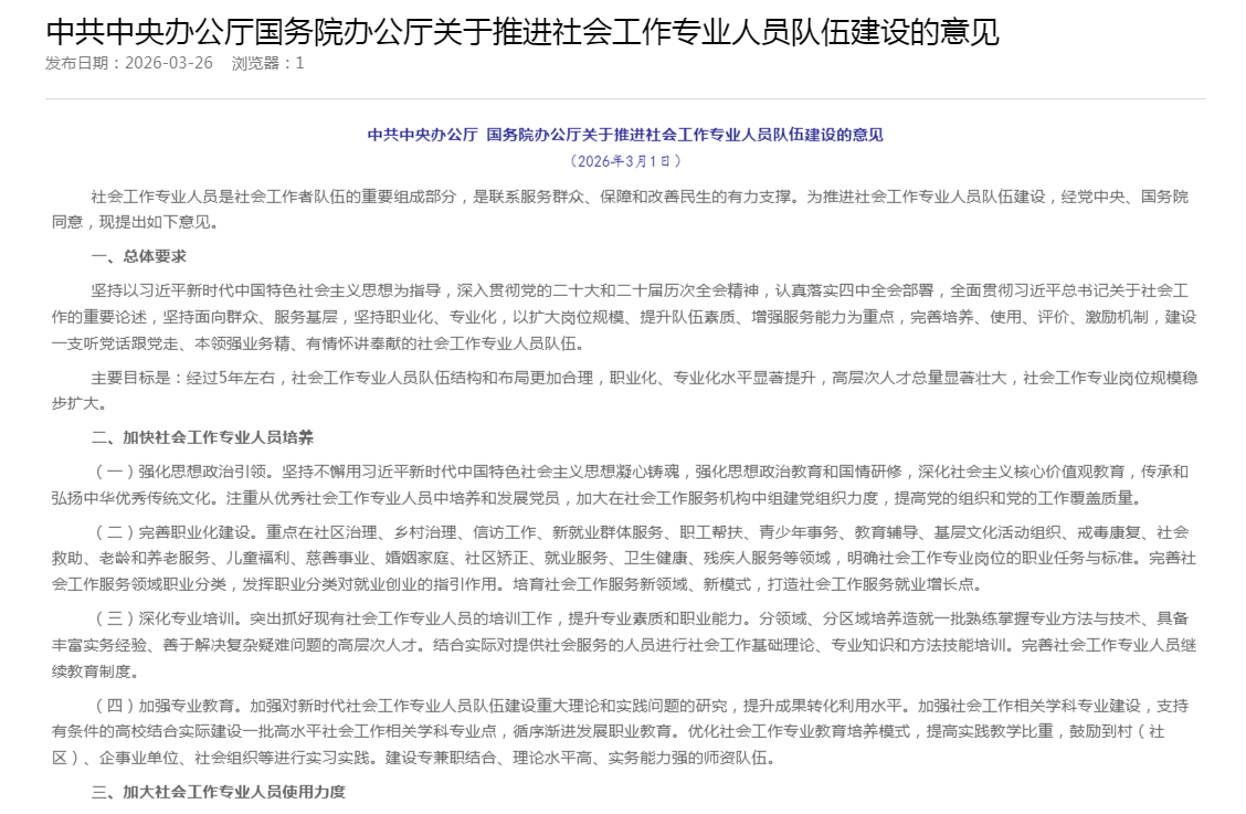 中共中央办公厅国务院办公厅关于推进社会工作专业人员队伍建设的意见